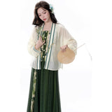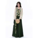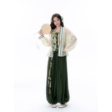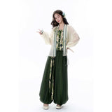 やわらかな風が水辺の草花をそっと揺らす、初夏の湿った庭園――そんな静かな自然の情景を閉じ込めたようなアイテム。キャミソールは、まるで朝露に濡れた植物たちをそのまま写し取ったかのような印象を与えます。花草が刺繍されたトップスは薄く透ける軽やかな生地で、風をはらむたびに空気と光を纏い、木漏れ日の中に立つような柔らかさと儚さを演出しています。パンツは、しっとりとした土や苔むした地面を思わせる落ち着いた色合い。動くたびに生地が揺れ、まるで草原の波のように静かに流れます。