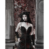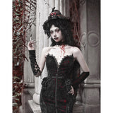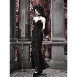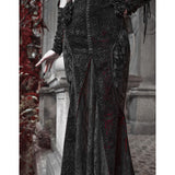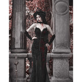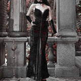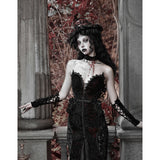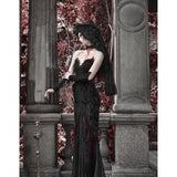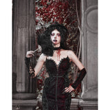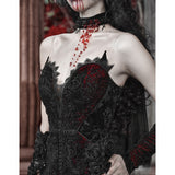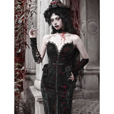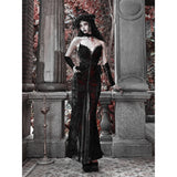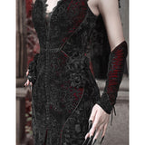 ドラキュラ城に住む吸血鬼の貴族からインスピレーションを受けて仕立てられたストラップワンピースとアームカバー。ヴィクトリア朝時代のゴシック様式を想起させるデザイン。黒地のレースとベルベットを組み合わせたアイテム。胸元は大胆なカットで、繊細なレースが縁取られ、ミステリアスかつ妖艶な印象を与えます。