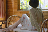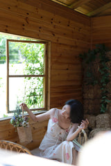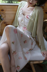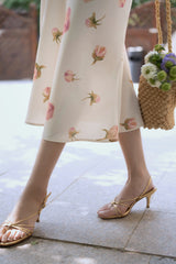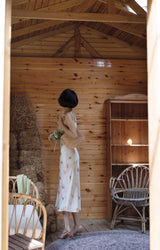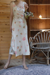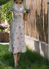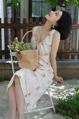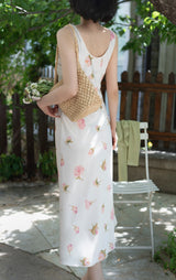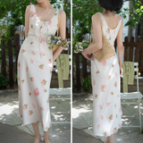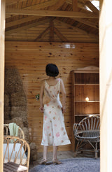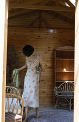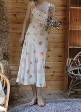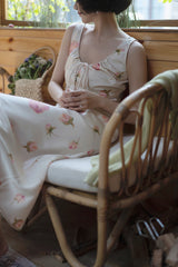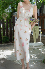 色鮮やかな花びらが幾重にも重なったラナンキュラスの花々を描いたノースリーブワンピース。やわらかな薄紅色の花が美しい、ロマンティックなフローラル柄。なめらかなドレープ感があり、胸元はリボンを結ぶことでサイズ感を調整することができます。