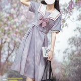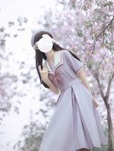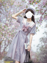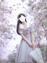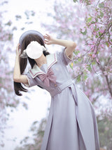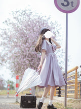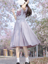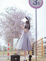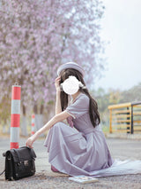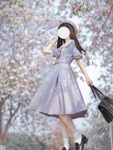 淡い薄紫色が優雅な雰囲気を与えてくれる文学クラシカルなワンピース。ウエストにベルトが装飾されており、胸元の徽章刺繍は花びらを模したデザイン。ゆったりと膨らむ裾がエレガントな印象を与えてくれる。リボンの胸飾りを合わせて、格調高き文学少女みたいに。