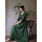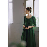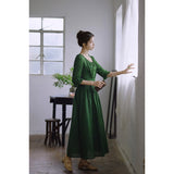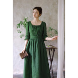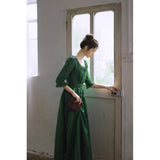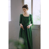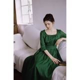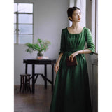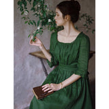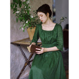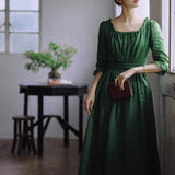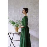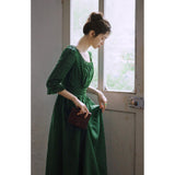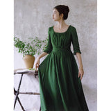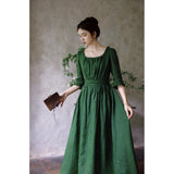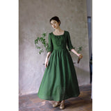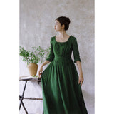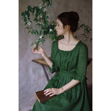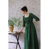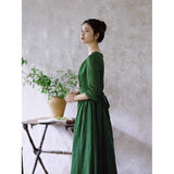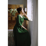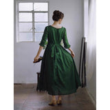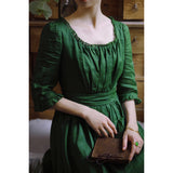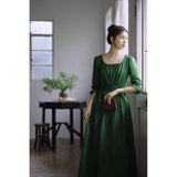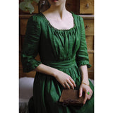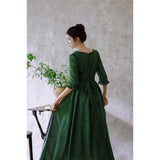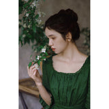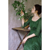 深い森のような緑色が美しい、クラシカルな雰囲気を漂わせるロングワンピース。ギャザーを寄せた胸元とウエストの切り替えが女性らしいシルエットを強調し、七分袖にはさりげないフリルが添えられています。背面にはリボンが結ばれ、可憐さと気品を兼ね備えたデザイン。落ち着いた色合いと素朴な質感が、アンティークの物語から抜け出したような印象を与えます。