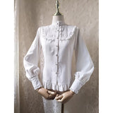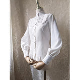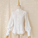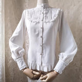 繊細なフリルとピンタックが胸元を縁取る、端正でクラシカルな印象のハイネックブラウス。首元から前立てにかけて整然と並ぶ小さなボタンが凛とした佇まいを引き立てます。肩から袖にかけてはふんわりと丸みを帯びたボリュームスリーブ。手首で締めたカフスが全体のシルエットをすっきりとまとめています。裾にはさりげないフリルがあしらわれ、甘さを控えめに漂わせながらも上品に仕上げられています。