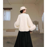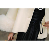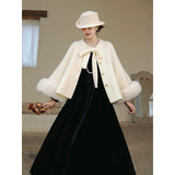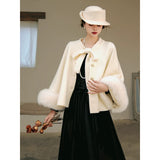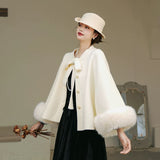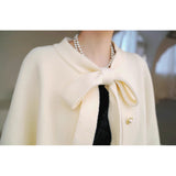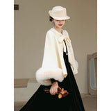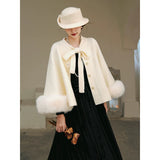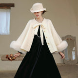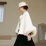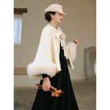 クラシック映画のヒロインのような気品と優雅さを纏うケープコート。柔らかなアイボリーカラーのウール地に、袖口を飾るふわりとしたフェイクファーが上品な温もりを添えています。首元には大きなリボンが結ばれ、ボタンが控えめに光を受けて華やぎを演出。ゆるやかに広がるAラインのシルエットが、動くたびにエレガントな雰囲気を醸し出しています。