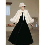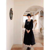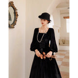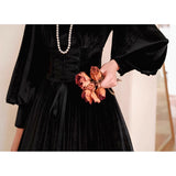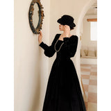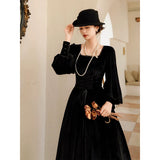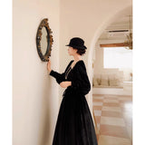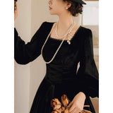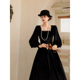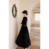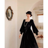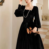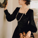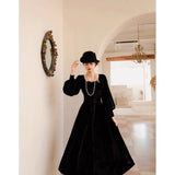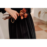 静謐で気高い存在感を放つ、まるで貴婦人のようなコルセットワンピース。濡れたようなブラックベルベットが織りなす艶やかさと、クラシカルなシルエットが印象的。ウエストにはコルセットのレースアップが施され、シルエットを引き締めながら優雅な曲線を描き出します。スクエアネックに繊細なレースの縁取りが施され、膨らみのあるパフスリーブが上品な印象を与えます。
