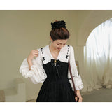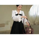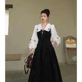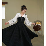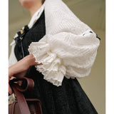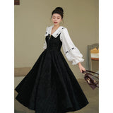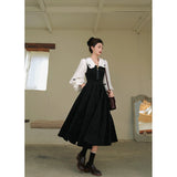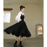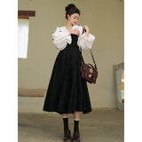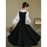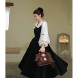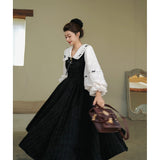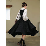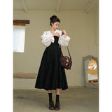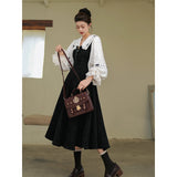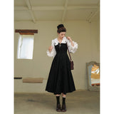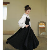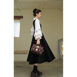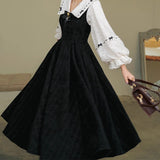 深みのあるブラック生地がたっぷりと広がり、歩くたびに優雅な弧を描くクラシカルなジャンパースカート。ヘリンボーンのような織り模様が上品な陰影を生み、胸元はすっきりとしたラインで仕上げられています。ウエスト位置が高めであることでスタイルに軽やかさが生まれています。レトロな雰囲気と気品ある存在感を併せ持つ、物語のヒロインの衣装のようなジャンパースカート。