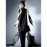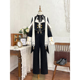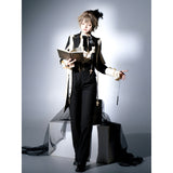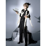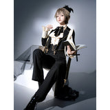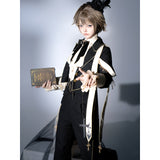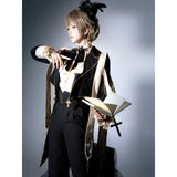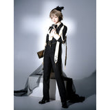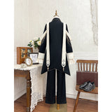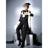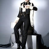 暗夜に祈る修道士みたいに演出してくれるアイテム。宗教的かつ神秘的な雰囲気を醸し出しています。ブラックを基調としたロングテールジャケットは、ゴールドの装飾とパイピングがアクセントとなっています。高貴で威厳のあるデザインで、肩や裾にはクロスや星のモチーフが垂れ下がっています。スリムなブラックパンツは、全体のシルエットを引き締め、洗練された印象を与えます。ウエストには装飾的なボタンがついており、クラシカルな要素をプラスしています。