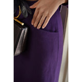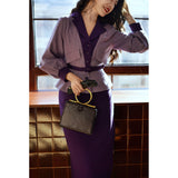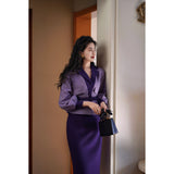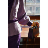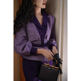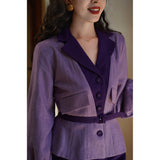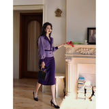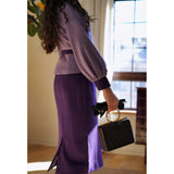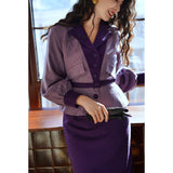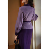 クロード・モネの絵画の世界に誘われたかのような鮮やかな紫色のテーラードジャケットとタイトスカート。ジャケットは、タイトなウエストラインが特徴的で、パフスリーブと大きめの襟がヴィンテージ感を強調しています。ウエストベルトでさらにシルエットを引き立てています。スカートはタイトなペンシルスタイルで、体に沿ったフィット感がフェミニンで洗練された印象を与えます。
