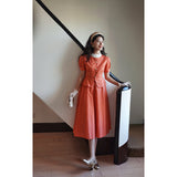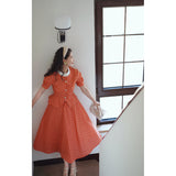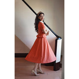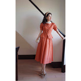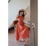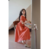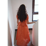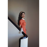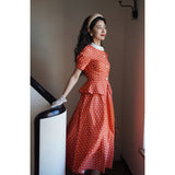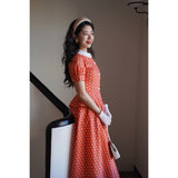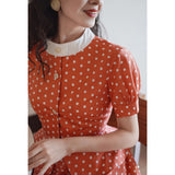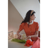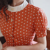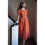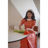 1950年代を彷彿とさせるポルカドットのトップスとスカート。深みのある赤朱色に、淡いミルキーホワイトのドットを滲ませたカラーリング。白い襟と大きめのフロントボタンがアクセントになり、レトロ感を引き立てています。ウエストを引き締めたデザインで、ふんわりと広がるスカートが優雅な印象を与えます。時代を超えた優雅さを纏いながら、あなたの日常にそっと寄り添う一着。