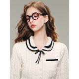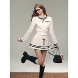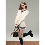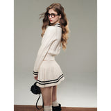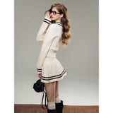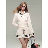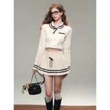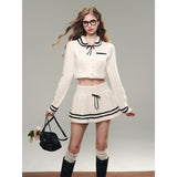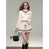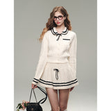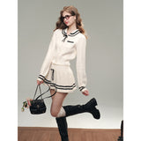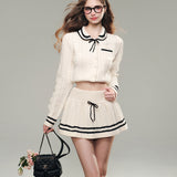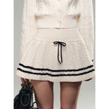 洗練されたカレッジスタイル。オフホワイトを基調とした細かなケーブル編みが印象的なショート丈のニットカーディガンとショートスカート。ブラックのラインが施され、全体にメリハリを与えています。ガーリーかつクラシカルな雰囲気を醸し出し、上品で可愛らしい印象を与えます。