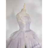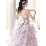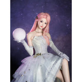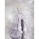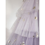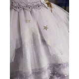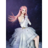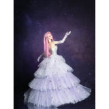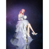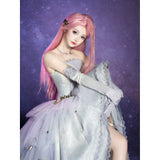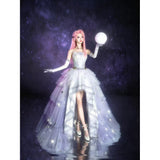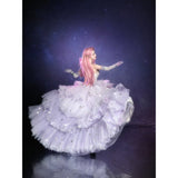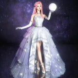 星のきらめきが、静かな夜空に降り注ぐ。地上に舞い降りた美しきヴィーナスみたいに演出してくれるアイテム。トップスは、V字の変形切り替えデザインが特徴的で、多層的で繊細な立体感を演出しています。美しいシルエットをしっかりキープし、ウエストをすっきり見せながらも締め付けすぎない着心地となっています。スカート部分はフロント部分が短く後ろが長いハイローデザイン。スカートの総使用生地量は約60メートルに及び、重ねられた層が生み出す広がりはまさに圧巻。まるで星空をそのまま閉じ込めたような輝きを放っています。