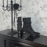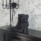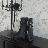 夜のサロンや舞踏会の余韻を閉じ込めたようなブーツ。ベルベットが静かな艶をまとい、足首に沿ってすっきりと立ち上がるシルエット。ヒールには透明感のあるジュエルをあしらい、彫刻のような存在感を持ちながらも全体の線を崩さず、クラシカルで少し幻想的な空気を漂わせています。繊細なパールチェーンと宝石のような装飾がくるぶしを囲むようにあしらわれ、視線は自然と装飾的なヒールへと導かれます。