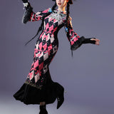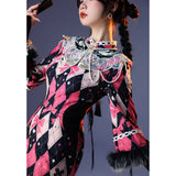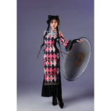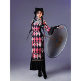 現実と夢を織り交ぜた魔法の一夜。おとぎ話の世界から飛び出してきたかのような華やかなチャイナワンピース。幾何学的なアーガイル柄と大胆な色使い。パールが装飾された華やかな付け襟が華麗な雰囲気を加速させてくれる。魔法の軌跡で舞いを導く、煌めきのマエストロ。