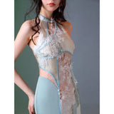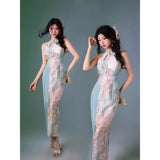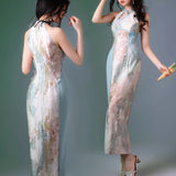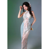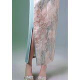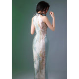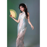 春の日差しを纏うような、軽やかで優美なひとときを演出してくれるチャイナワンピース。立体的に刺繍されているのは、芳しい香りを放つ白木蓮の花。経年の美を感じさせるかすれたような質感が上品な表情を見せてくれる。裾にはレーザーカットのレースと、繊細なスパンコールが重なり、光を受けてさりげなく煌めきます。まるで物語の中から現れたかのような一着。着る人自身が花のように咲き誇ります。
