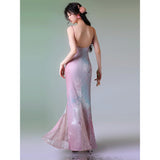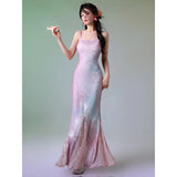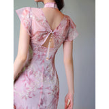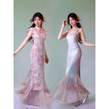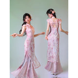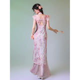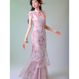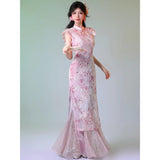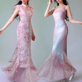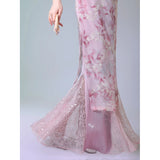 春の花園を纏ったような幻想的なチャイナワンピース。淡いピンクを基調に、海棠の花が柔らかく広がり、可憐で儚げな印象を与えます。シアーなオーガンジーやチュール素材に繊細な刺繍が施され、裾部分にはスパンコール入りのレースが重なり、動くたびにきらめくような仕掛けが施されています。