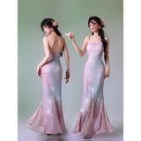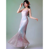 フィットするマーメイドラインで、膝下から広がるシフォンが、まるで蝶が舞うような軽やかさを演出。ロマンティックでフェミニン、まるで花精霊が人間界に舞い降りたかのような、儚くも華やかな一着。