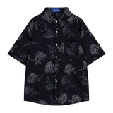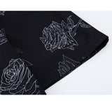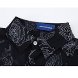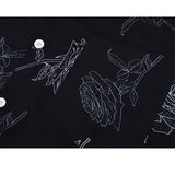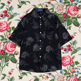 絢爛に咲いた薔薇を白地の線画で描いたシャツ。黒すぎるほどの黒と白地のコントラストが見事。漆黒の闇夜に妖艶に咲く薔薇の花。咲き誇る黒薔薇で永遠の愛を表現しました。カジュアルなボトムスに合わせてみて。