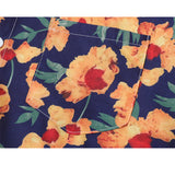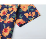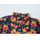 橙色の花々を油彩画で描いたシャツ。深みのある濃紺色とのコントラストが美しい。降り注ぐ陽光を浴びて煌びやかに輝く花々。鮮やかな色彩に目を奪われる。カジュアルなボトムスに合わせてみて。