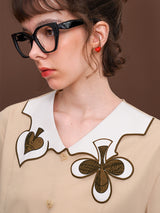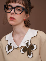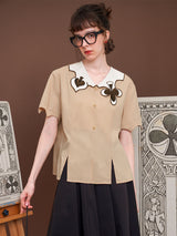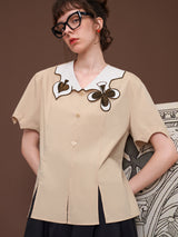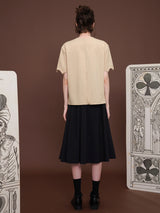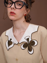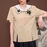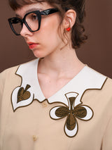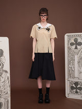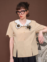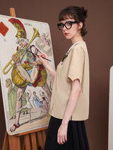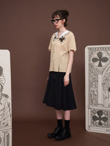 ヨーロッパのアンティークな木版トランプに影響を受けて仕立てられたブラウス。襟部分には棍棒を象徴したクローバーと、剣を象徴したスペードの刺繍が装飾されています。袖口はジグザグに波打ったデザインで、裾部分には切れ込みが入っています。西洋文明の薫りを感じてみて。