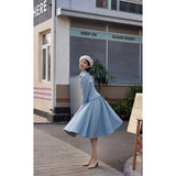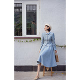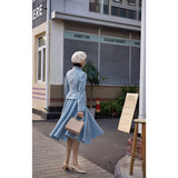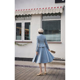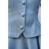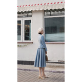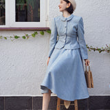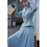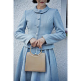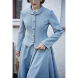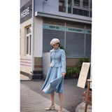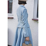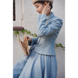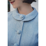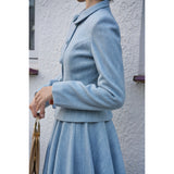 1950年代を彷彿とさせるクラシカルなツイードジャケットとツイードスカート。勿忘草の花みたいな色合いのアイテム。スカートは歩くたびになめらかに揺られて、優雅な印象を与えてくれる。映画のスクリーンの中から飛び出してきたかのような美しき貴婦人に。