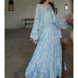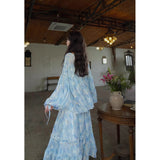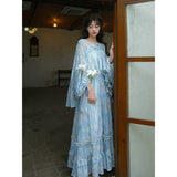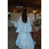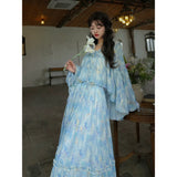 幻想的に咲き誇る藤の花を水彩で描いたブラウスとロングスカート。爽やかな空のような柔らかな水色をベースに、煌めきのある輝金彩が施されています。たっぷりとしたドレープ感があり、歩くたびにしなやかに揺られます。水彩画のように淡く美しいブルーと、きらめく金彩が織りなす幻想的な世界観は、まるで朝靄をまとったようなロマンチックな雰囲気。