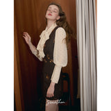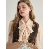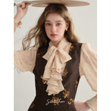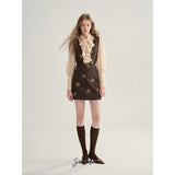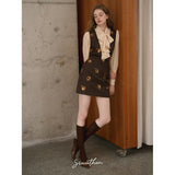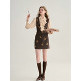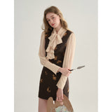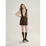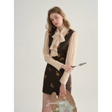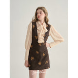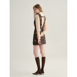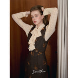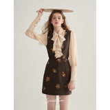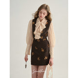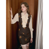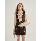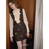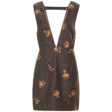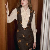 クラシカルでエレガントな印象を与えるジャンパースカート。ブラウンの生地にスパンコールの刺繍がアクセントとなっており、ヴィンテージ風の魅力を引き出しています。スリムなシルエットがボディラインを美しく見せ、背面のストラップデザインが上品さをさらに強調しています。