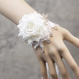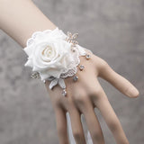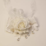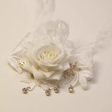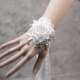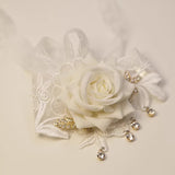 白い薔薇を主役に、繊細なレースが幾重にも重なり合い、手首にそっと花が咲いたかのようなリストレット。柔らかく広がる花びらの立体感が、静かな気品と儚さを同時に纏わせ、周囲には小さなビジューが雫のように揺れます。