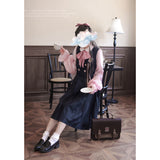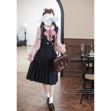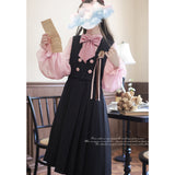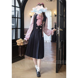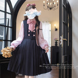 格調高き文学少女みたいに演出してくれるジャンパースカートとブラウス。ジャンパースカートはウエスト位置が高く、ブラウスと同じピンクのボタンが付いています。ダークネイビーとピンクのコントラストに魅了される。知的な上品さを宿したエレガントなアイテム。