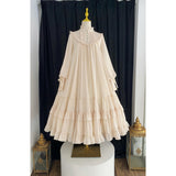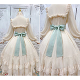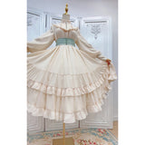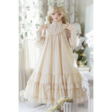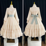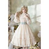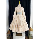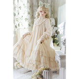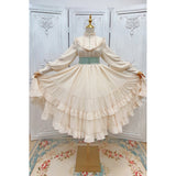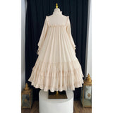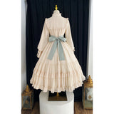 ゆったりとした優雅なシルエット。胸元に華やかなフリルを装飾し、袖口に編み上げが装飾されたクラシカルなワンピース。大きめの襟が清純で気品溢れる印象を与えてくれる。ウエストリボンを結んで、華麗なる貴族のお嬢様に。