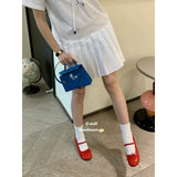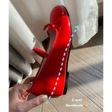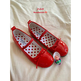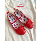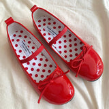 童話物語の世界に誘われたようなロマンティックな雰囲気のバレエシューズ。鮮やかな赤いエナメルが特徴的。甲部分にはリボンとストラップが施されており、ガーリーな印象を演出します。インソールにはレトロな赤の水玉模様がデザインされ、内側まで可愛らしさを感じる仕上がりになっています。