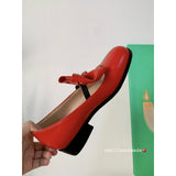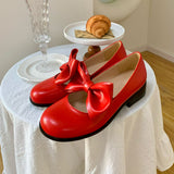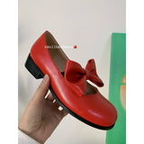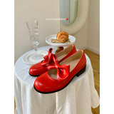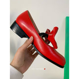 ビビッドレッドのリボンが映えるメリージェーンパンプス。丸みを帯びたラウンドトゥのデザイン。存在感のある大きめのリボンが甲の部分に飾られており、可愛らしい雰囲気を演出します。ちょっぴりレトロでガーリーな靴に仕上げています。