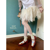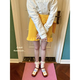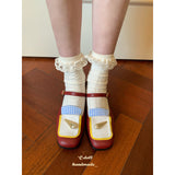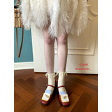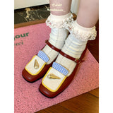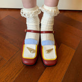 ホイップクリームを塗ったトーストの上に、アイスクリームを乗せた可愛らしいデザインのメリージェーンパンプス。スクエアトゥデザインがクラシカルな雰囲気を醸し出しています。ギンガムチェックのディテールが可愛らしさをプラスしてくれる。