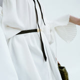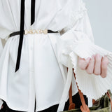 洗練された印象を与えてくれるナローベルト。バックル部分はパールが装飾されており、煌びやかな雰囲気を併せ持っています。合わせ方次第で特別感のある装いに演出してくれる。お洋服の上から締めてウエストマークする使い方もおすすめです。