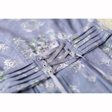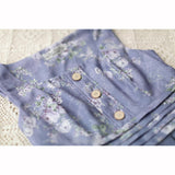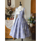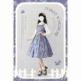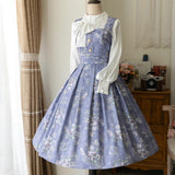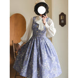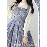 青みがかった藤色の空の下で、絢爛に咲き誇る薔薇を精緻に描いた水彩画のジャンパースカートとハイネックなリボンブラウス。ウエスト部分はコルセットを締めたようなデザインとなっており、バックには編み上げが装飾されています。ふわっと広がる裾がエレガントな雰囲気を演出してくれる。生地は程よい厚みがあります。ハイネックなブラウスには刺繍レースが施されており、リボンは取り外しが可能となっています。