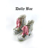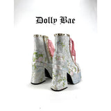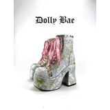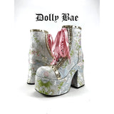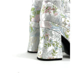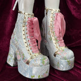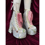 ロマンティックで芸術的な存在感を放つレースアップブーツ。淡いブルーグレーを基調に、クラシカルな花柄ジャカード生地が全体を覆い、まるでアンティークのタペストリーのような優雅さを感じさせます。ピンクのサテンリボンが甘く結ばれ、ゴールドのスタッズと縁取りが華やかさを添えています。高めのチャンキーヒールとプラットフォームがドールライクなシルエットを生み出しています。