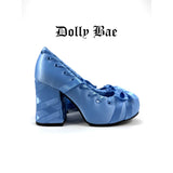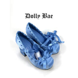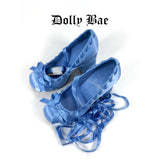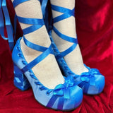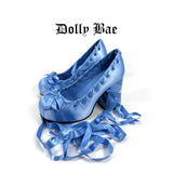 クラシカルでフェミニンな世界観を纏う、バレエヒールパンプス。艶やかなサテン生地が足元を優雅に包み、甲に結ばれた小さなリボンと、かかとから足首にかけて巻き上がるサテンリボンが繊細でロマンティックな印象を与えます。レースの靴下やドレスと合わせればまるで舞踏会のヒロインのよう。