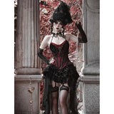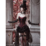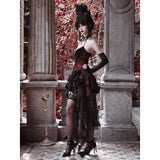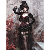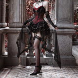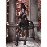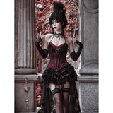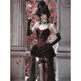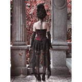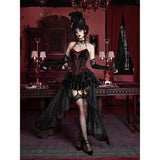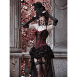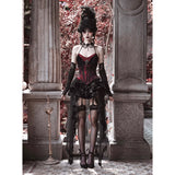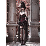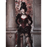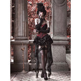 ドラキュラ城に住む吸血鬼の貴族からインスピレーションを受けて仕立てられたベルベットのティアードレーススカート。ヴィクトリア朝時代のゴシック様式を想起させるデザイン。段を重ねて膨らみを持たせたショートスカートと、レースのオーバースカートを組み合わせたようなデザイン。