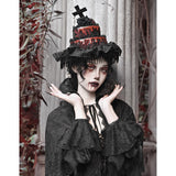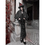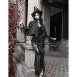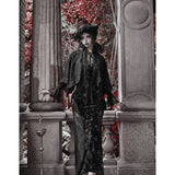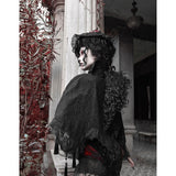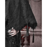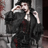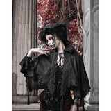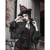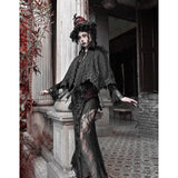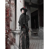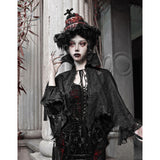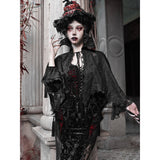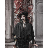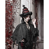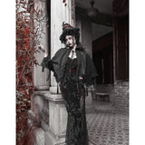 ドラキュラ城に住む吸血鬼の貴族からインスピレーションを受けて仕立てられた刺繍ケープとアームカバー。ヴィクトリア朝時代のゴシック様式を想起させるデザイン。黒地のレースを組み合わせたアイテムで、重厚感とミステリアスな雰囲気を与えています。