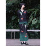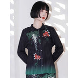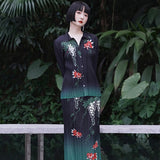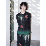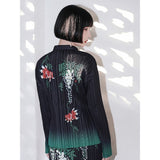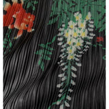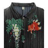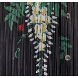 優雅に泳ぐ金魚が大胆に描かれたプリーツトップス。金魚の頭上には艶やかに咲き誇る藤の花が描かれています。水の中をゆらゆらと泳いでいるような姿がロマンティック。柔らかなプリーツが繊細な流れを生み出し、動くたびに柄が優雅に揺れます。