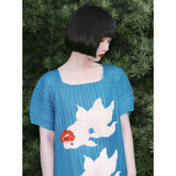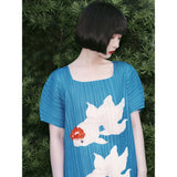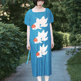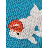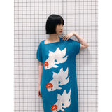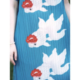 優雅に泳ぐ金魚が大胆に描かれたワンピース。金魚の頭上には鮮やかな椿の花びらがあり、華やかな印象を与えてくれる。水の中をゆらゆらと泳いでいるような姿がロマンティック。澄んだ池みたいな次縹色がどこか神秘的。