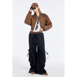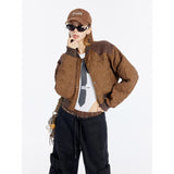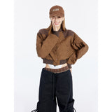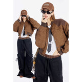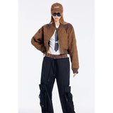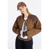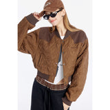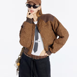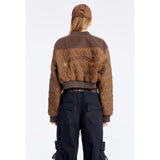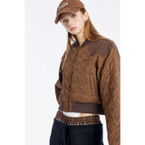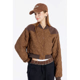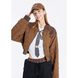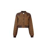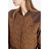 キュートなハートのキルティングジャケット。クロップド丈でトレンド感があり、ハイウエストボトムスと相性抜群。落ち着いたブラウンの色合いで、カジュアルながらもデザイン性が高く、都会的な印象を与えます。