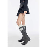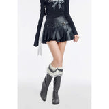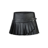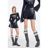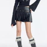 ガールに戻れるキュートなブラックレザーのプリーツスカート。映画のヒロインの気分で1980年代に思いを馳せて。重厚感のあるデザインながらも、程よくカジュアルダウンできて、可愛らしさも兼ね備えています。ウエスト部分には星形スタッズとバックルベルトが施され、ロックな印象を強調しています。