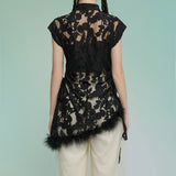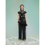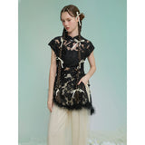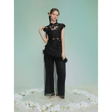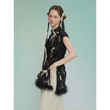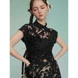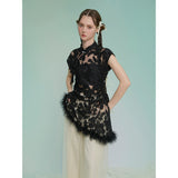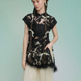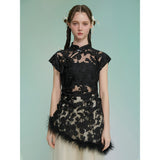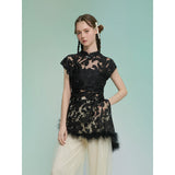 透け感のある花のレースが上品な印象を与えるチャイナトップス。立ち襟やチャイナボタンなど、伝統的なディテールを取り入れつつ、ボディラインにフィットする現代的なシルエットにアレンジされています。レースの透け感が軽やかさを演出してくれる。裾部分には、フェイクファーがあしらわれ、華やかさと遊び心をプラスしています。