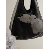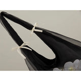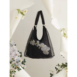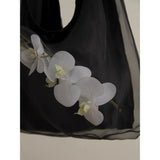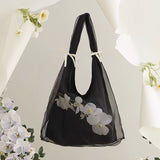 光沢のあるサテン生地の本体に、オーガンジーのふんわりとしたカバーを重ねたショルダーバッグ。立体的な胡蝶蘭のモチーフが横に連なって施されており、儚げでエレガントな印象を与えます。肩紐部分にはリボンが結ばれており、繊細な可憐さを加えています。