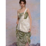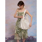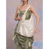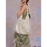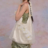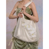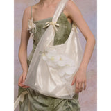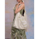 光沢のあるサテン生地の本体に、オーガンジーのふんわりとしたカバーを重ねたショルダーバッグ。立体的な胡蝶蘭のモチーフが横に連なって施されており、儚げでエレガントな印象を与えます。肩紐部分にはリボンが結ばれており、繊細な可憐さを加えています。
