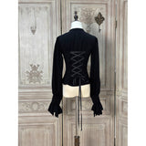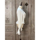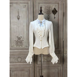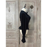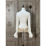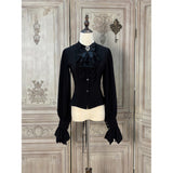 優雅さとクラシカルな気品を纏ったヴィクトリアンブラウス。フロントには幾重にも重ねられたフリルが縦に走り、上品さと華やかさを演出しています。袖は長めで、手首にかけてたっぷりとギャザーが寄せられ、袖口には大きく広がるフリルカフスが付いており、ドラマティックな印象を与えます。背面には編み上げが施されており、シルエットを美しく整えるだけでなく、クラシカルな雰囲気をさらに高めています。