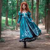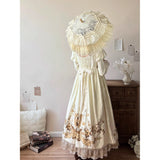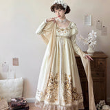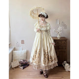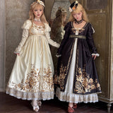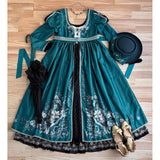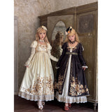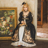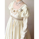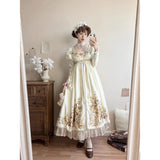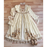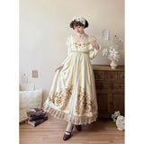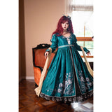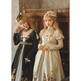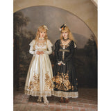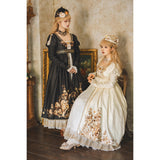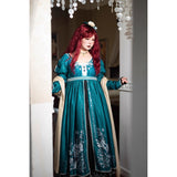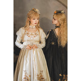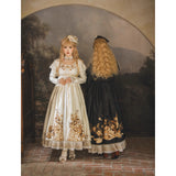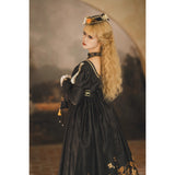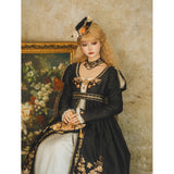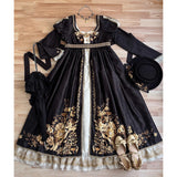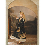 中世ヨーロッパの少女のような幻想世界を表現したワンピース。ハイウエストなエンパイアシルエットが特徴的で、繊細な花柄が描かれており、華やかで上品な印象を与えています。王侯貴族の肖像画から抜け出したかのような威厳と気品が感じられる、クラシカルロリータとゴシックロリータの境界を溶かすようなスタイル。ノスタルジックで幻想的な物語世界に誘われてみて。