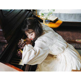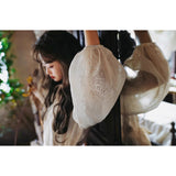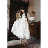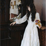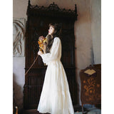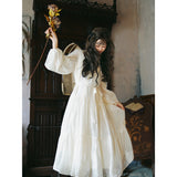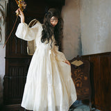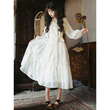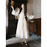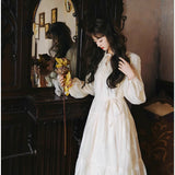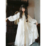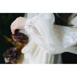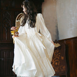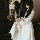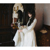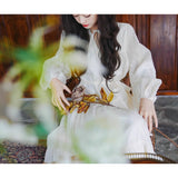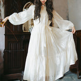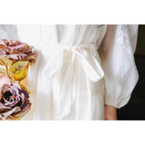 繊細な印象の白い彼岸花を大胆に刺繍したロングワンピース。ゆったりとしたドレープ感のあるシルエット。首元とウエストをリボンで結べるようになっています。袖部分はわずかに透け感があります。細長く繊細な花弁が美しい彼岸花。幻惑の花の楽園に誘われてみて。