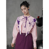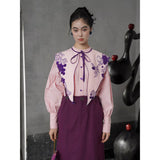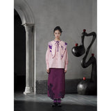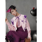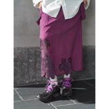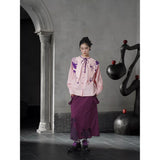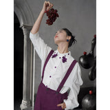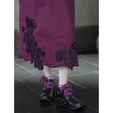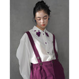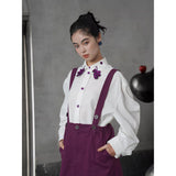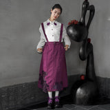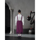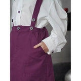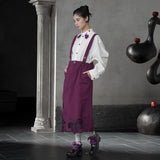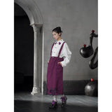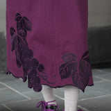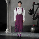 大粒の宝石を散りばめたような葡萄と葉っぱを刺繍したストラップスカート。張りのある生地がすっと縦に落ち、身体の動きに合わせて静かに揺れるます。肩から伸びる太めのストラップと整然と並ぶボタンが構築的な印象を与える一方、裾にあしらわれた葡萄と葉の刺繍が、熟した果実の重みや蔓のしなやかさを思わせ、足元に近づくほど物語性が濃くなるようにデザインされています。