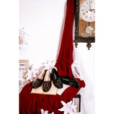古い洋書や手紙が散りばめられた赤いベルベットの世界観の中で、どこか退廃的でロマンティックな“ゴシックなお嬢様”の物語を思わせるヒールシューズ。丸みのあるトゥとフロントのバックルがクラシカルな気品を漂わせ、低めの太ヒールがアンティーク調の落ち着きを醸し出しています。まるで古いヨーロッパの書斎で静かに物語を紡ぐ少女をイメージして制作されたような、知的で甘やかな余韻をまとったデザイン。