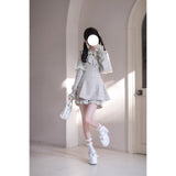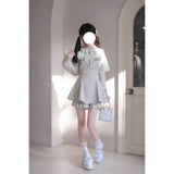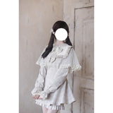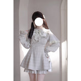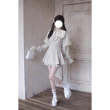 淡いベージュトーンのチェック柄を基調に、繊細なレースと大きなリボン装飾をあしらった、上品でガーリーなワンピース。肩にはふんわりと重ねられたシフォンのケープスリーブが乗り、袖口はシャーリングとレースで柔らかく広がり、ロマンティックな雰囲気を引き立てています。胸元の大ぶりなレースリボンは存在感があり、全体の甘さを上品にまとめるアクセント。ウエストから裾にかけては控えめに広がるAラインシルエットで、その下からのぞくフリル付きのインナーボトムがセットアップのように可憐なニュアンスを添えています。クラシカルでありながら現代的な可愛らしさを兼ね備えたガーリーエレガントなアイテム。